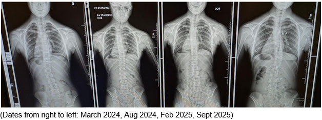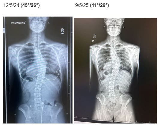 • Radiographic Changes: After 5 months of consistent practice, a follow-up X-ray showed a significant improvement in her spinal curves: